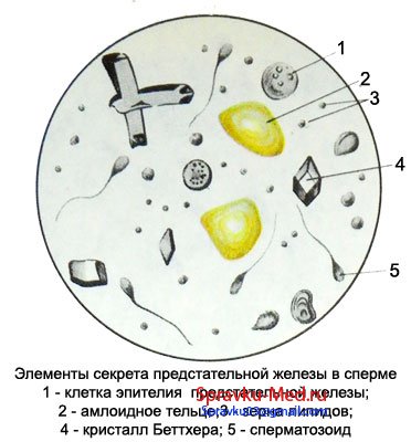 • При нормальном состоянии в жидкости не должны присутствовать эритроциты, сперматозоиды, кристаллы Бетхера, амилоидные тельца.